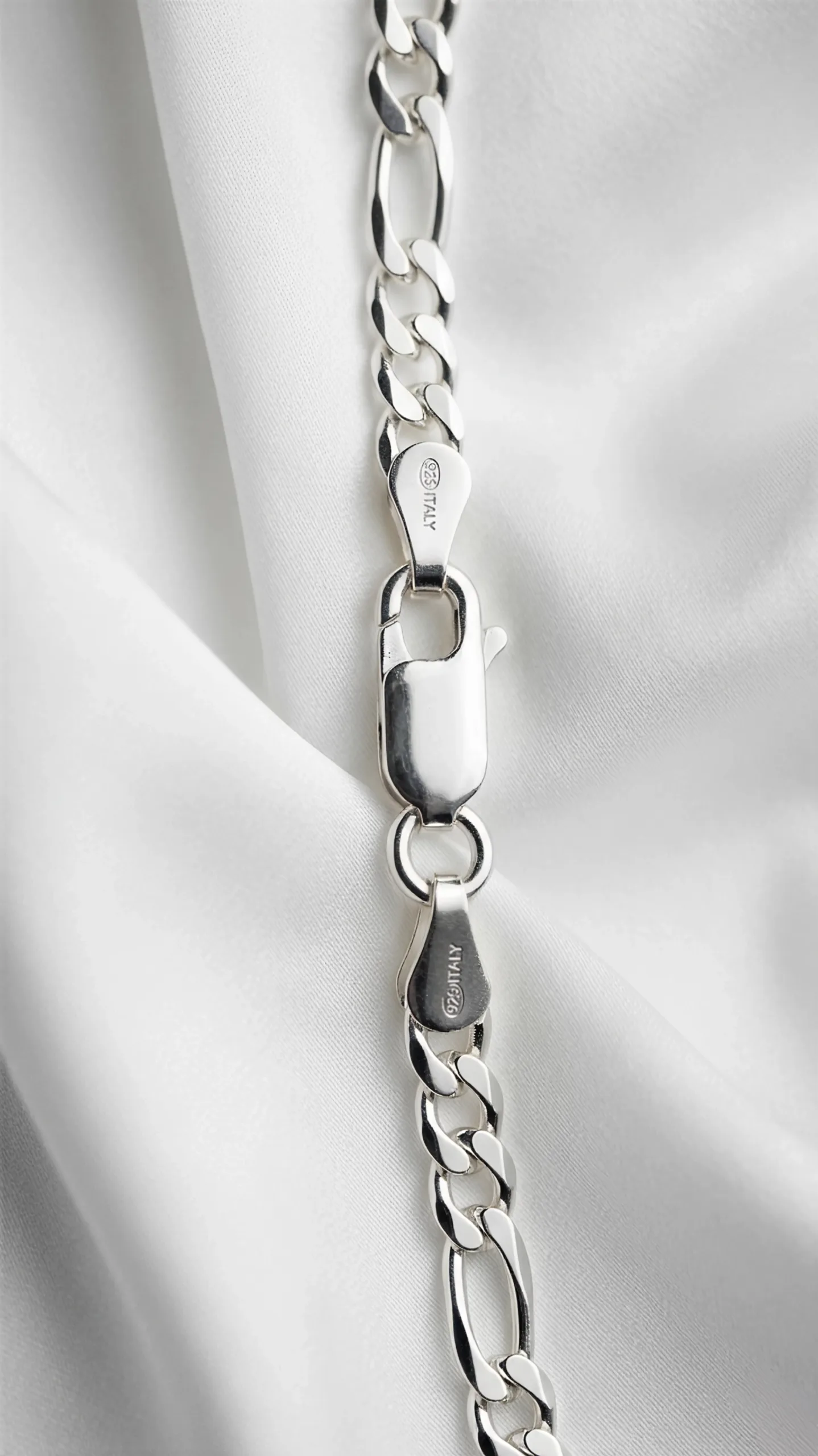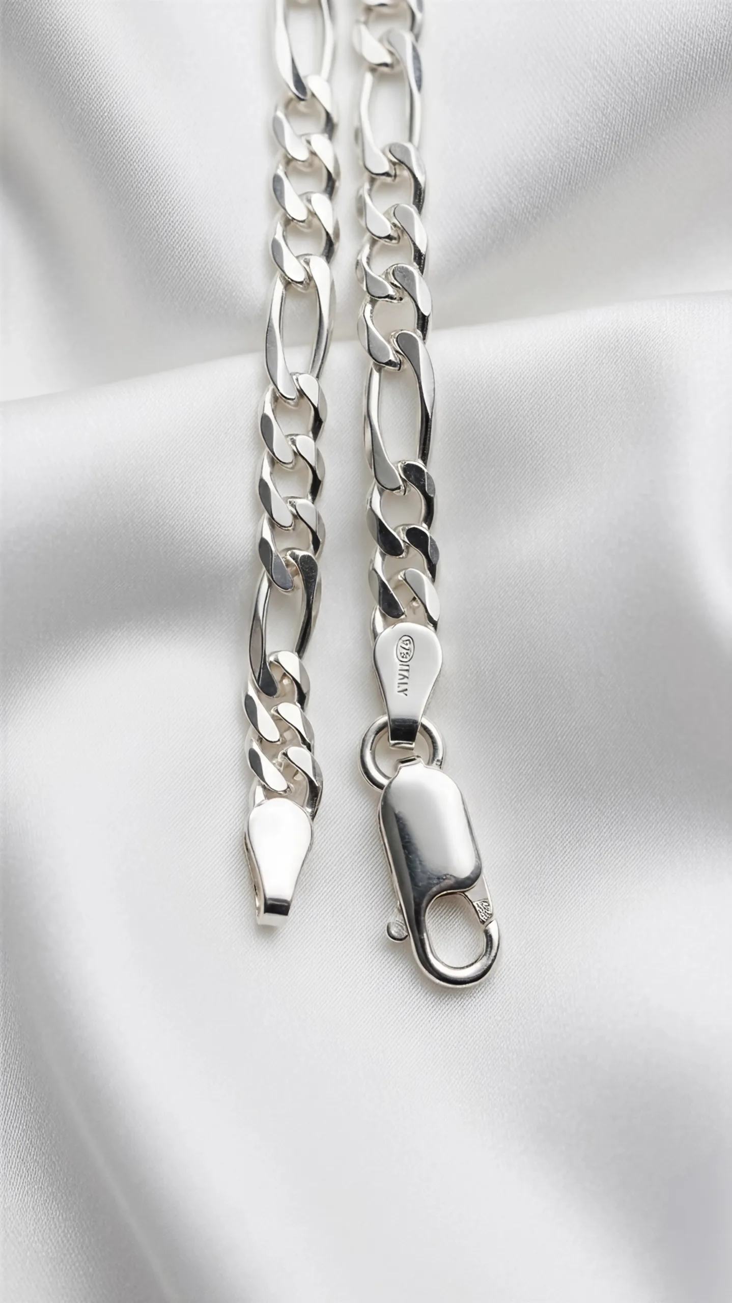 A bold statement of quality. Featuring the iconic Figaro pattern, this 925 silver bracelet is designed for durability and high-shine. The Rhodium plating acts as a protective barrier against oxidation, maintaining its premium white-gold appearance.