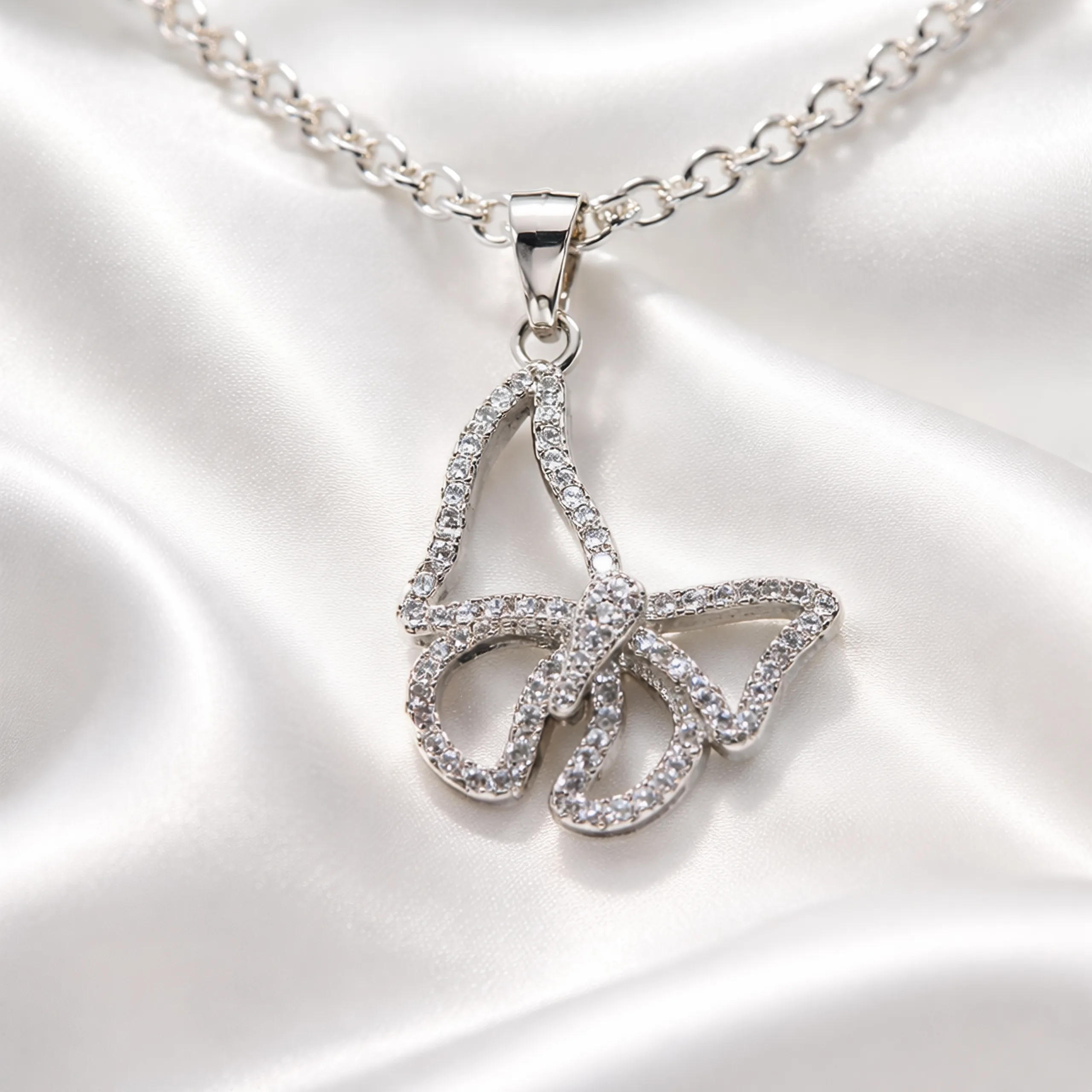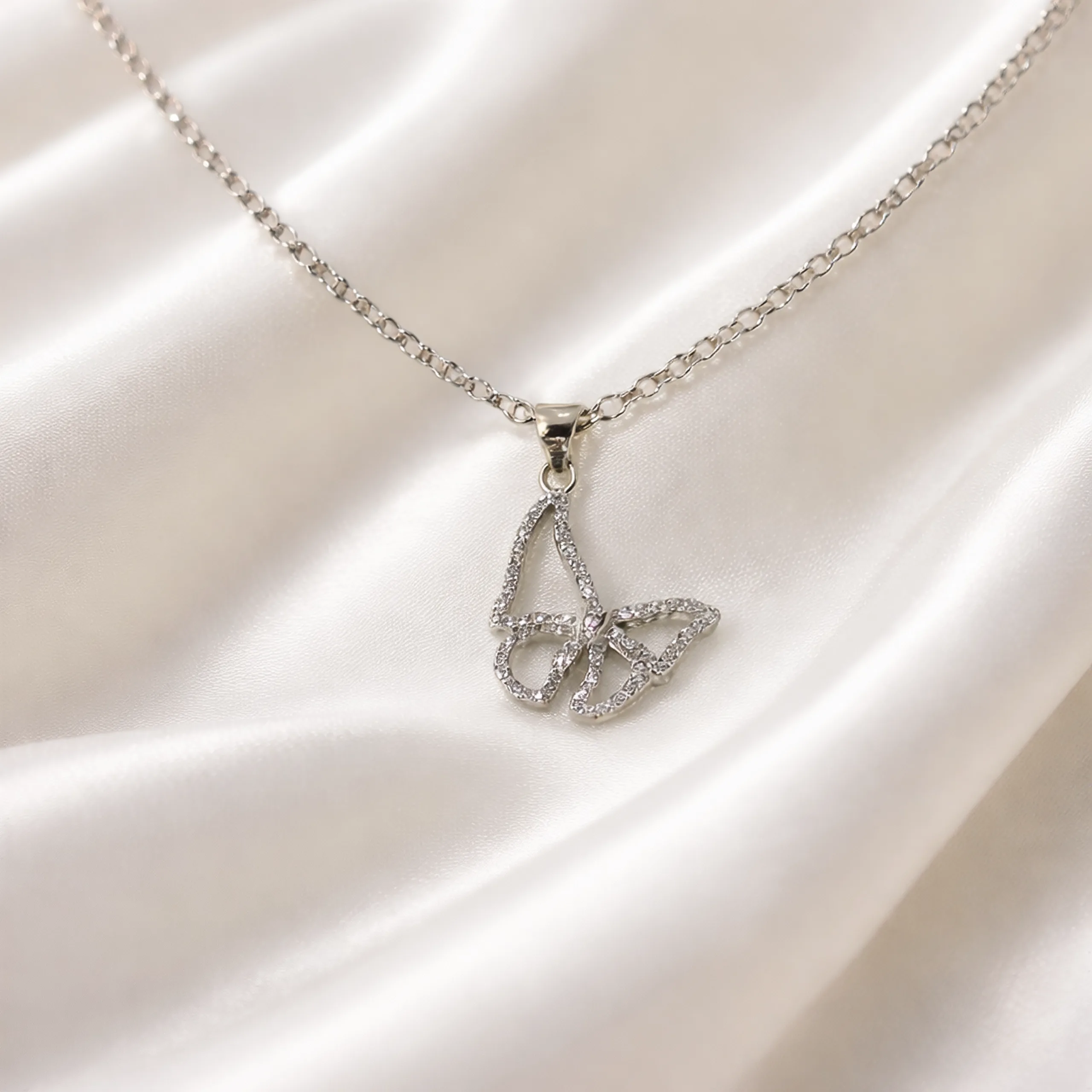 Capture the beauty of nature with this delicate butterfly pendant. The wings are fully encrusted with shimmering stones for a light aesthetic.