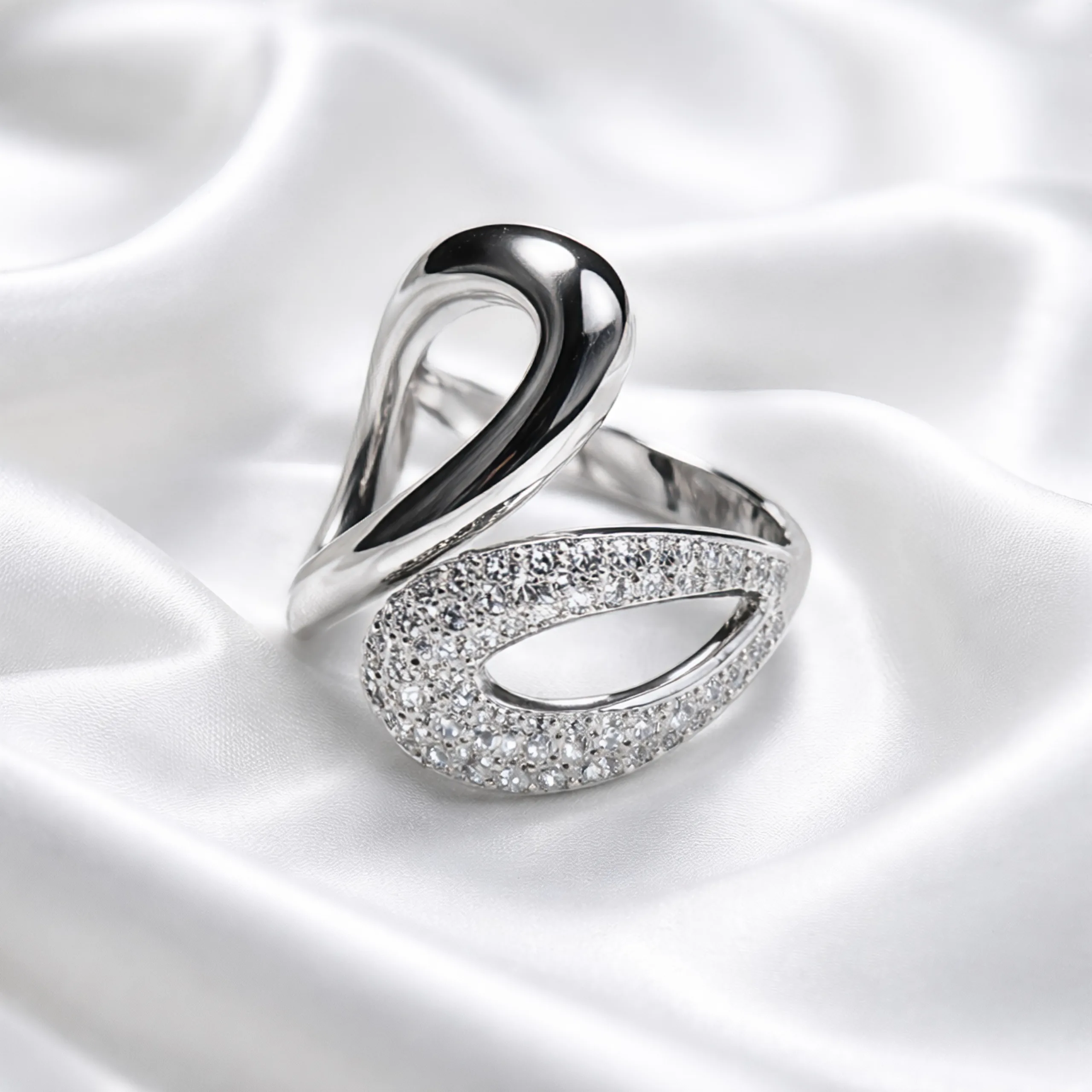 A bold, contemporary crossover ring featuring an abstract infinity silhouette. One loop is encrusted with brilliant pavé stones for a striking contrast against polished silver.